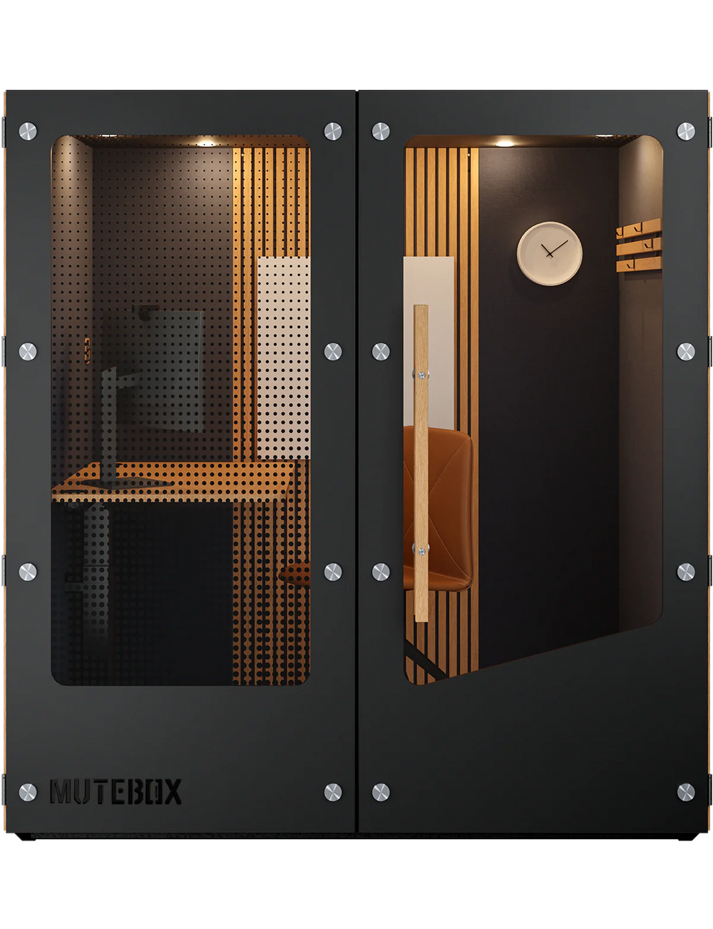 MuteBox One Dual Glass adskiller sig ud fra den klassiske MuteBox One ved at have glas på to sider af boksen. Det gør boksen transparent og let i kontormiljøet.