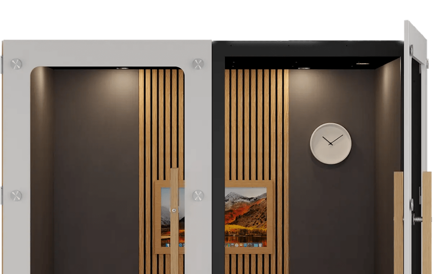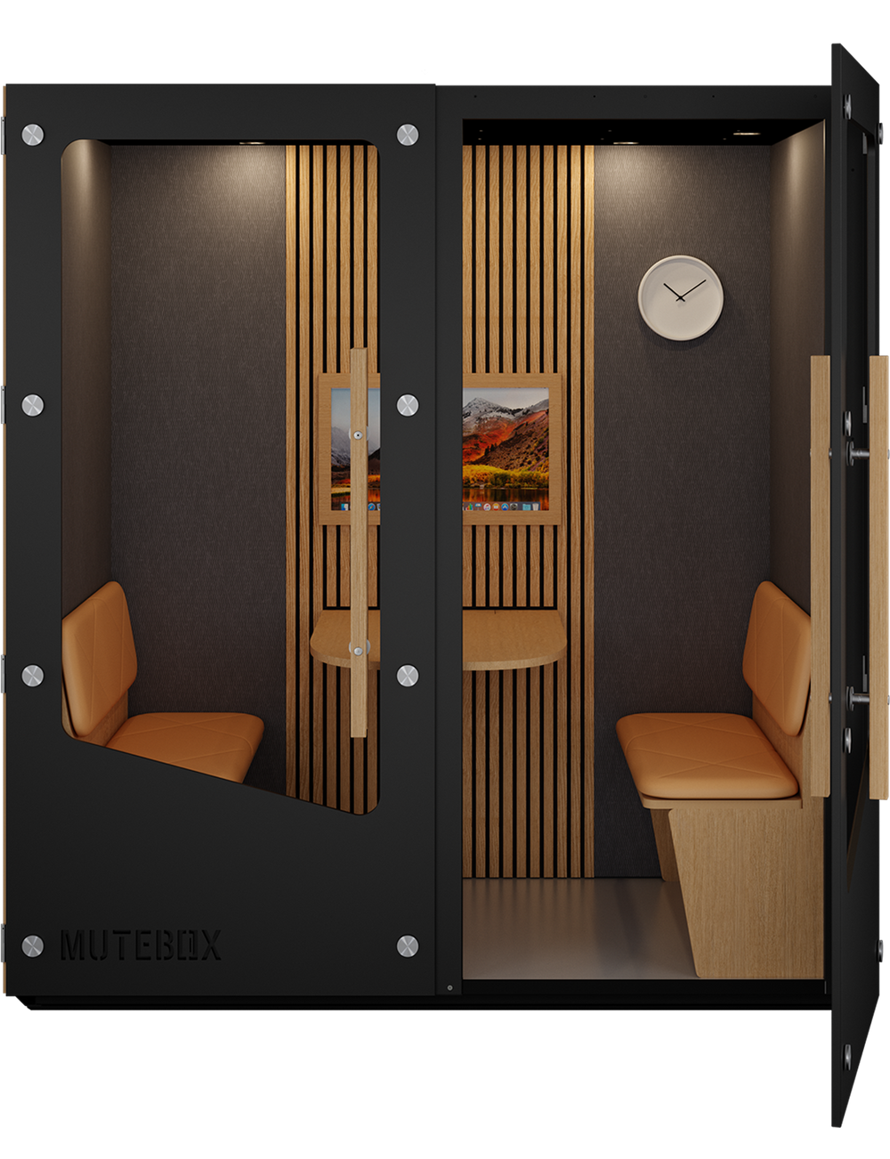 MuteBox Meet er designet med dobbeltdøre, som gør det let og fleksibelt for flere personer at samles til møder i MuteBoxen.