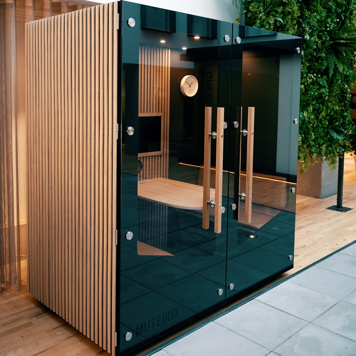 MuteBox er beklædt med lamelpaneler i høj kvalitet både indvendig og udvendig. Panelerne uden på boksen forbedrer akustikken i rummet, hvor MuteBoxen står.