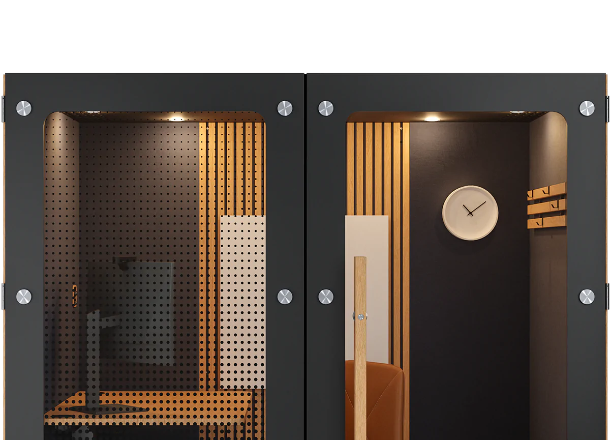 MuteBox Work tilbyder tilpassede muligheder, herunder tilpasning af hængsler, tilføjelse af gulvtæppe, ændring af lamellernes farve og tilvalg af integreret skærm eller whiteboard. Disse tilpasningsmuligheder skaber et unikt og personligt arbejdsrum, der afspejler virksomhedens stil og medarbejdernes behov.
