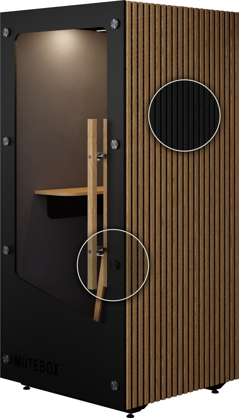 Nu tilbyder vi også, at du kan lave unikke tilpasninger og tilvalg, så din MuteBox passer perfekt ind på netop jeres kontor. Vær opmærksom på, at en tilpasset MuteBox har særlige leveringstider, da din ordre laves specielt til dig på vores fabrik i Danmark.
